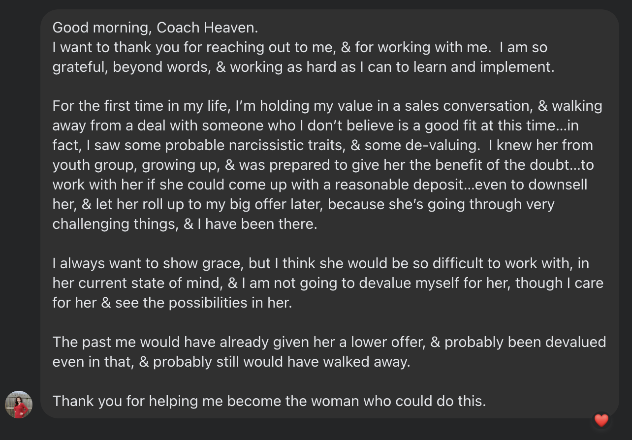 WOW! I just had an amazing call with Coach Heaven â life changing! So many questions answered. I now have much more clarity about the whole process. A BIG WIN is the clarity I now have on PRICE! Another WIN is clarity on curriculum for the foundational level. Thanks Coach Heaven â you are the best!